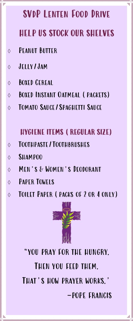 The Church tells us that it is the entire parish’s responsibility to support and welcome those preparing for baptism, confirmation and Eucharist this Easter. One of the many ways you can do this is to become a prayer partner for one of our Elect and candidates. You are asked to pray every day for him/her during Lent, asking for God’s blessings and guidance. Also, notes and cards will be collected during Holy Week to be given to the Elect before Easter. Prayer cards are available at the place of prayer located in the church near the Blessed Sacrament Chapel in Our Lady of Guadalupe Church and at the east side of the church near the St. Joseph Shrine in Holy Rosary Church, where you can also learn more about each of them in our Book of the Elect & Candidates (which is also on our websites). Your prayers make a difference!!